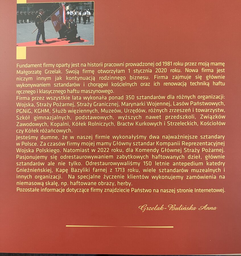 Uroczystość wręczenia sztandaru była wyjątkowym wydarzeniem, które podkreśliło wieloletnią tradycję klubu. Sztandar, symbolizujący dumę i prestiż sekcji, powstał dzięki ogromnemu wysiłkowi i pracy Pań z Pracowni Haftów Artystycznych Grzelak - Bulińska. Przy jego tworzeniu spędzono niezliczone godziny, starannie dobierając materiały, projektując detale i wykonując hafty, co wymagało precyzyjności i zaangażowania.